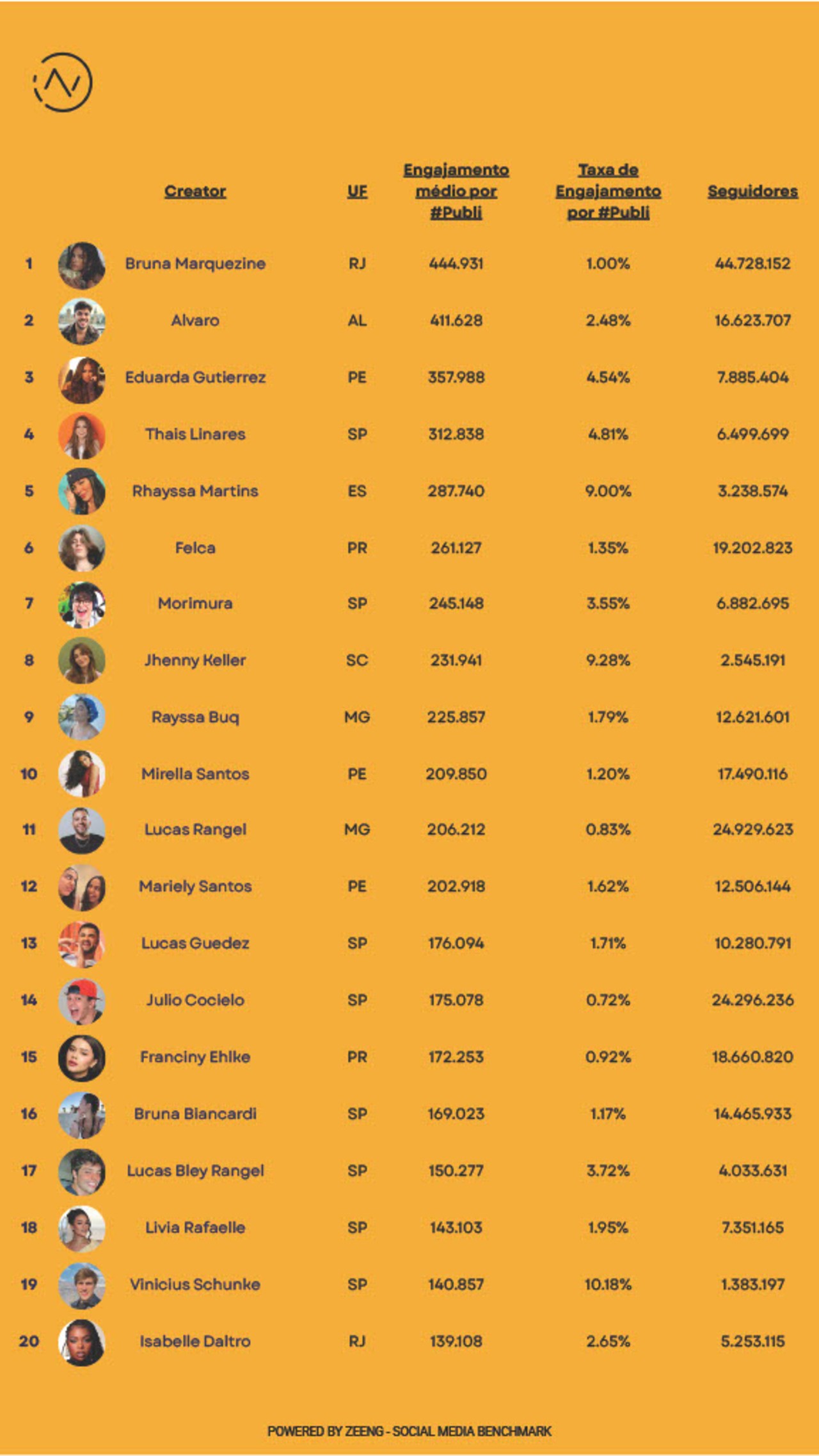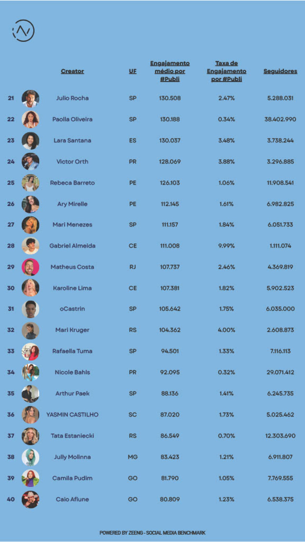 O ranking define, com base em dados de engajamento, quem são os influencers brasileiros que realmente convertem audiência em valor publicitário. Veja, abaixo, o Top 10: