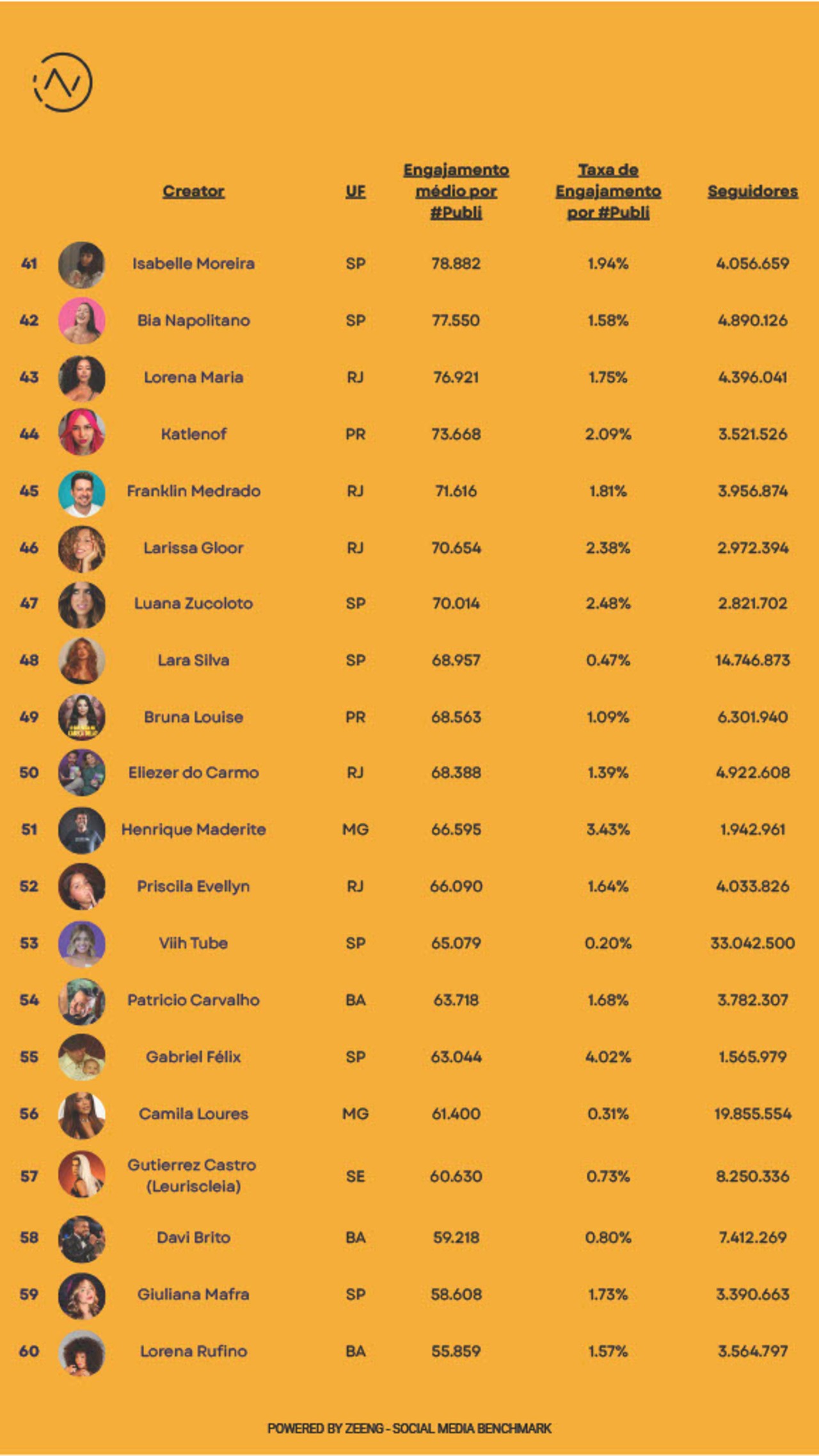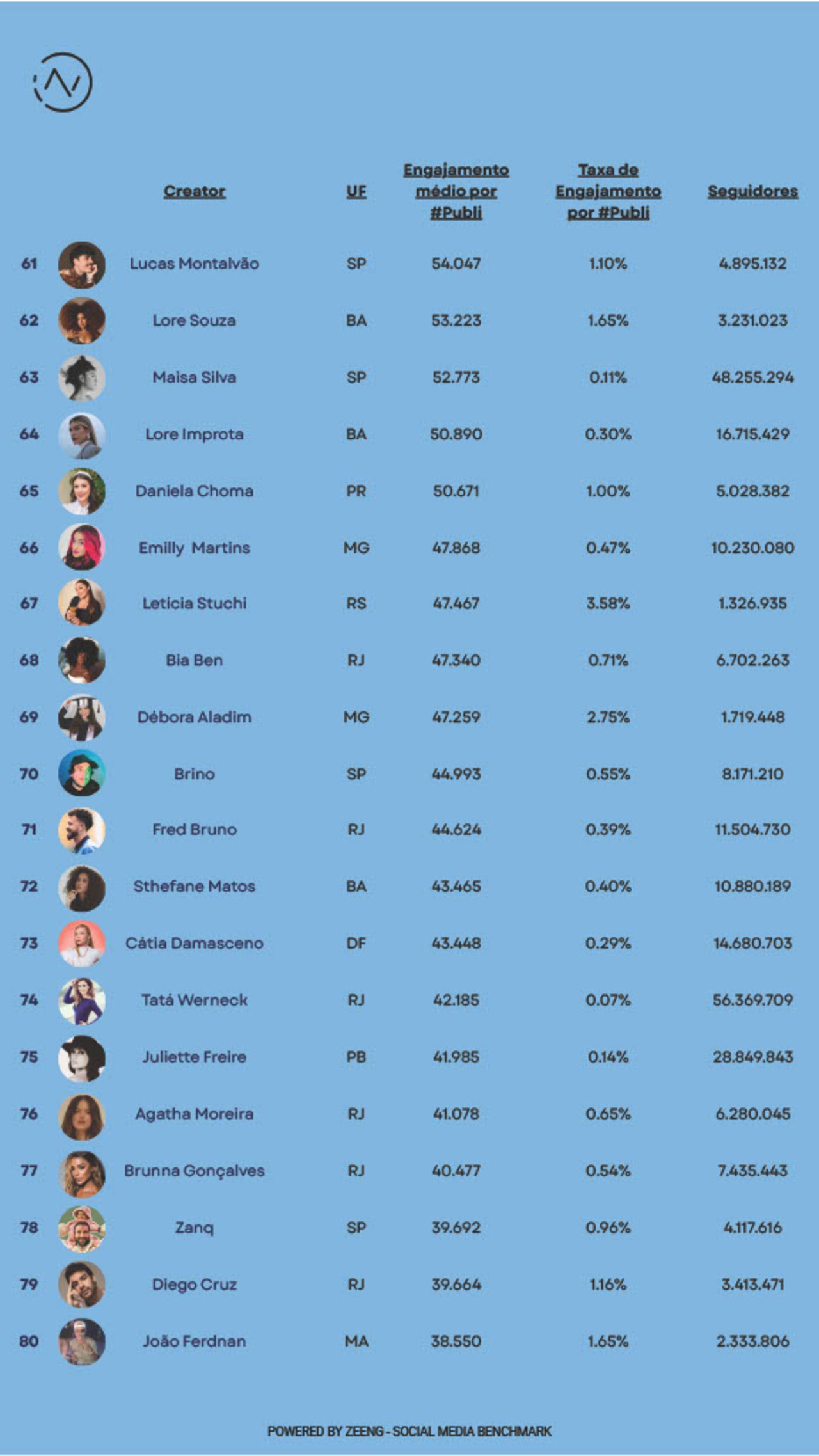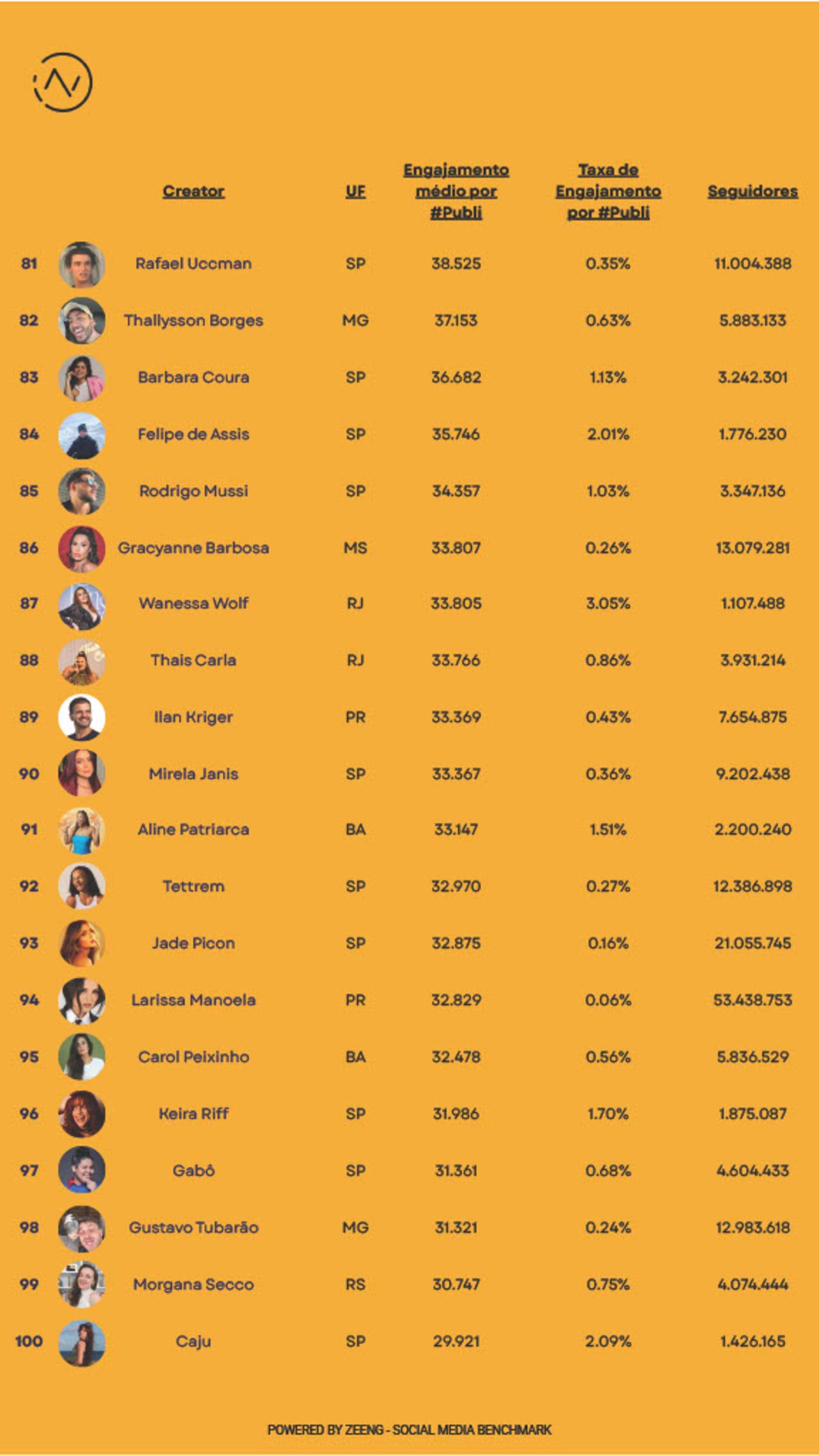 Entre os cem maiores nomes do país, a Zeeng identifica média de 96,9 mil interações por publicação e taxa de 2,15%. Sessenta e cinco por cento dos perfis são femininos, e o Sudeste concentra 63% do total.