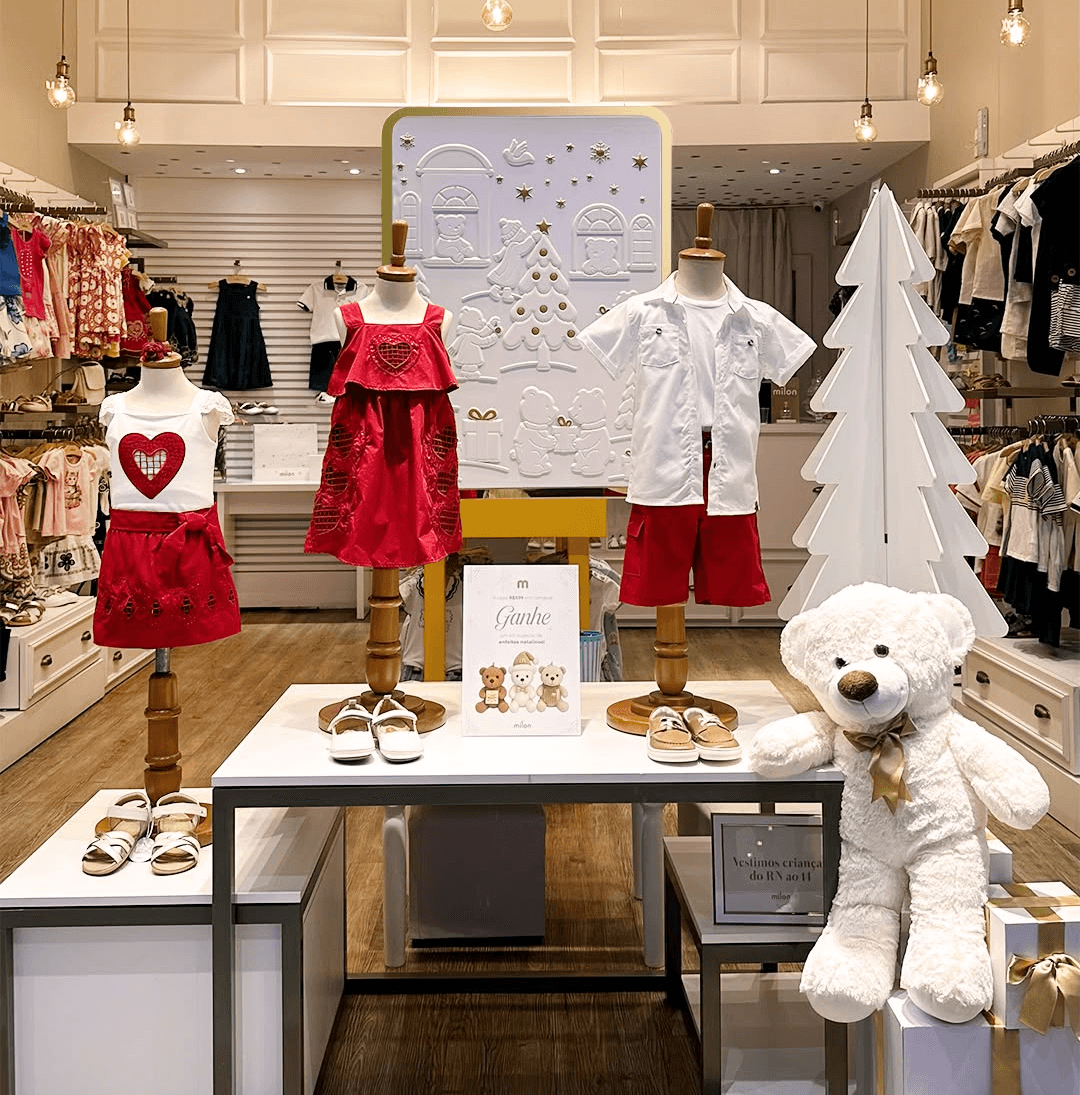 A Milon transformou suas lojas em cenários mágicos com ursos de pelúcia, vitrines nevadas e ambientação elegante. O grande atrativo é o kit de ursinhos para árvore, presente cumulativo que vira símbolo afetivo. A campanha une estética delicada, experiência sensorial e looks festivos pensados para crianças. O storytelling reforça memória afetiva e magia infantil.