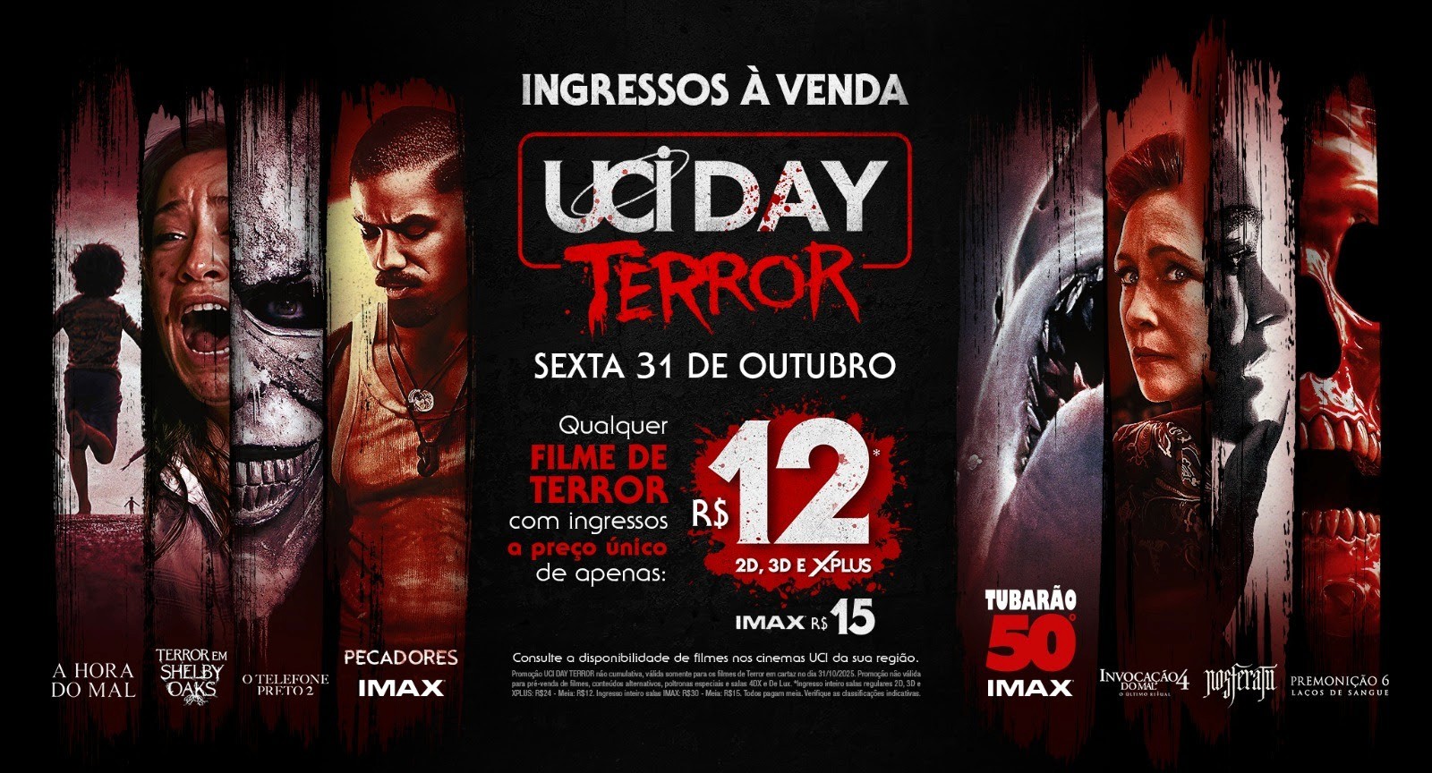 A semana do Halloween promete ser intensa nos cinemas da UCI, que realiza mais uma edição do UCI Day Terror no dia 31 de outubro. A rede exibe dez filmes com ingressos promocionais a R$12,00 ou R$ 15,00 (IMAX), incluindo sucessos como Pecadores, favorito ao Oscar 2026, e estreias como Terror em Shelby Oaks e Bom Menino. De 31 de outubro a 2 de novembro, a primeira edição do UCI Day Halloween convida as crianças a irem fantasiadas às sessões de A Noiva-Cadáver e Frankie e os Monstros.