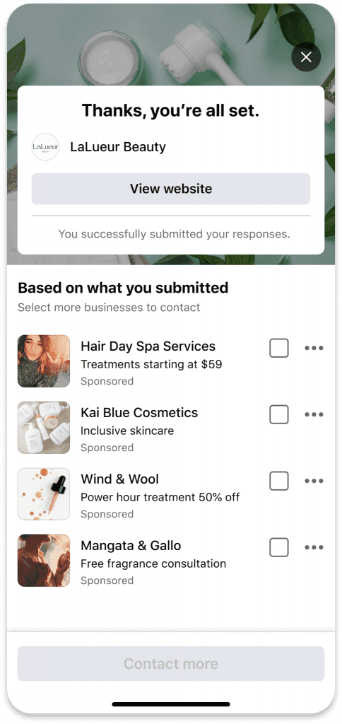 2. Advantage+ para geração de leads: A Meta está testando a automação completa para campanhas de geração de leads, com a tecnologia Meta Advantage. Os anunciantes de geração de leads poderão aplicar facilmente a IA a diversos impulsionadores da campanha de uma só vez, o que permitirá maior desempenho e economia de tempo e investimento.3. Para otimizar o tempo das pessoas, um formato de anúncio de formulário instantâneo: Para permitir que alguém descubra, considere e selecione diversas empresas para enviar informações de uma só vez. Imagine se deparar com um anúncio para se inscrever em um teste de cabelo para noivas – depois que a pessoa preenche o formulário, ela tem a opção de compartilhar suas informações de contato com outras empresas que também podem ser relevantes além do salão de beleza do anúncio. Isso significa mais conveniência para os usuários e, para as pequenas empresas, mais oportunidades de serem descobertas por pessoas que possam estar interessadas em seus negócios.