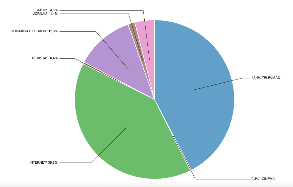 Na segunda colocação, a internet foi o destino de 39,8% das injeções financeiras. A divisão dos investimentos neste canal se mostra mais complexa em comparação à TV. Os R$ 10,4 milhões direcionados à web se dividem entre: display e outros (60,9%), social (23,9%), vídeo (7,9%), busca (7,1%) e áudio (0,3%).