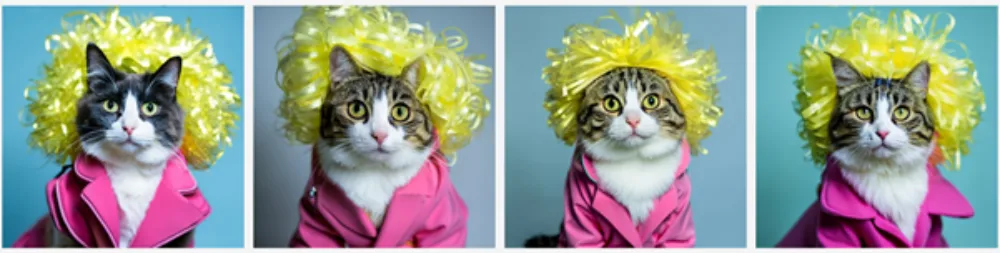 “Retrato de um gato vestindo um terno rosa e uma peruca de cabelo amarelo na cabeça; estúdio, realista, humor. Excluir: Nenhum. Manter aparência: Desativado. Definições: 1:1 – Fotos.”