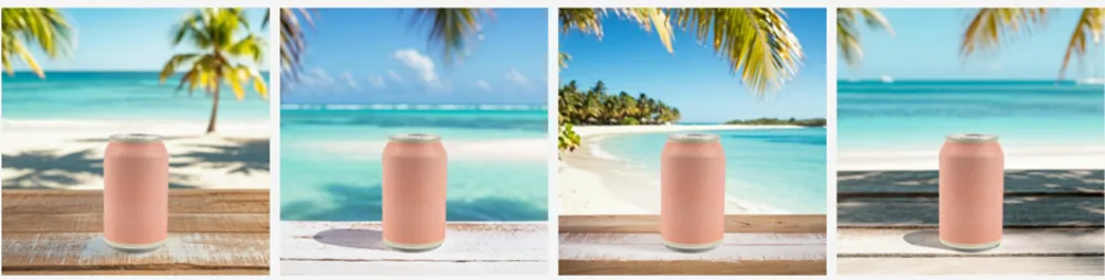 “A lata está sobre uma mesa de madeira em primeiro, plano localizada em uma praia de areias brancas em um dia ensolarado com céu azul sem nuvens e mar em tom turquesa ao fundo, palmeiras aos lados; profundidade de campo rasa, luz natural. Excluir: Nenhum. Manter aparência: Desativado.”