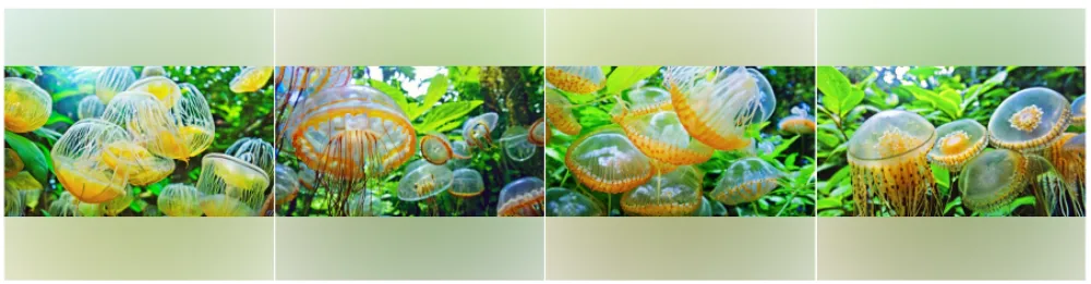 “Água-viva, água-viva listrada e manchada complexa e colorida, várias águas-vivas nadando em uma grande floresta tropical, floresta de plantas e árvores verdejantes, foto realista, clima atmosférico, foco seletivo, fotográfico, vibrante e altamente detalhado, surreal, saturado, distância. Manter aparência: Desativado. Excluir: oceano, mar, estúdio Definições: 4:3.”
