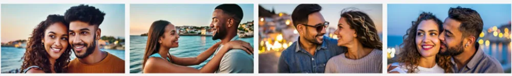 Um casal jovem, moderno e multiétnico olhando um para o outro com um foco suave em uma charmosa vila costeira ao fundo ao anoitecer com uma luz suave em tons pastel. Excluir: Nenhum. Manter aparência: Desativado.”