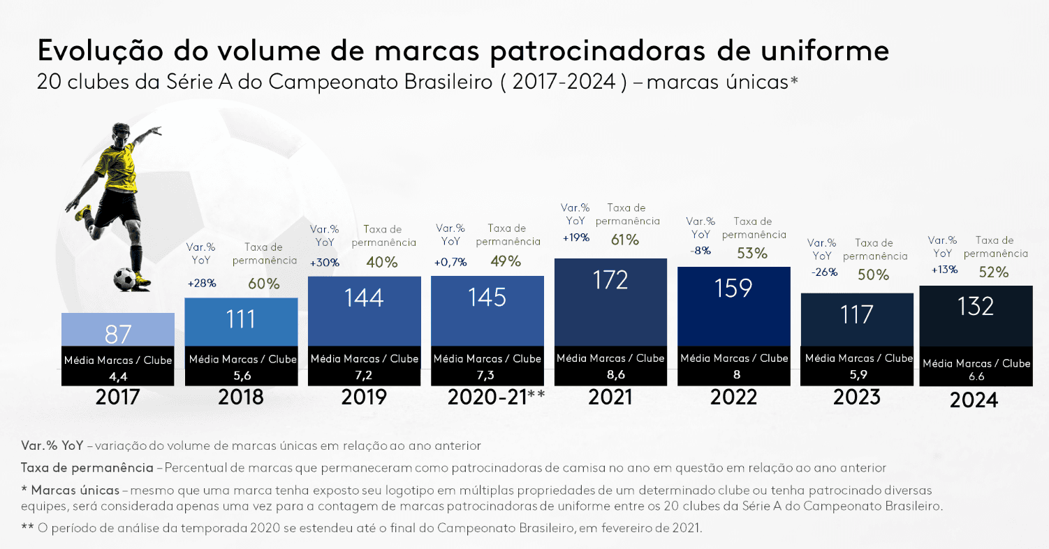 Pensando nisso, a empresa divulgou a edição 2024 do Mapa do Patrocínio de uniformes de futebol no Brasil. O levantamento mapeou os setores nos quais se inserem os patrocinadores dos 20 clubes da Série A do Campeonato Brasileiro, demonstrando a evolução destas indústrias no mercado esportivo ao longo da última temporada.