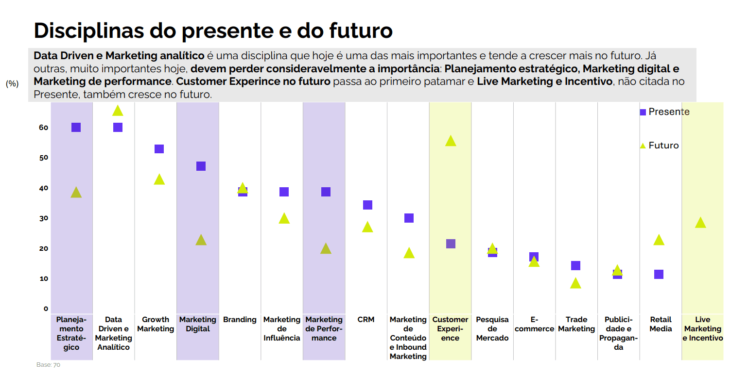 A busca por comprovação de resultados está diretamente ligada ao avanço das metodologias baseadas em dados. Disciplinas como “Data Driven” e “Marketing analítico” aparecem entre as mais importantes hoje e são vistas como ainda mais relevantes para o futuro. Já áreas tradicionalmente valorizadas, como planejamento estratégico e Marketing de performance, tendem a perder importância nos próximos anos.