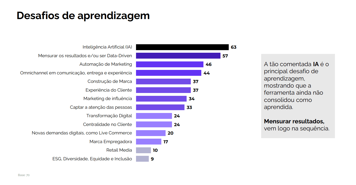Inteligência Artificial (63%) lidera o ranking de desafios de aprendizagem dos CMOs. A tecnologia, embora amplamente discutida, ainda não foi totalmente absorvida pelo setor. Na sequência, aparecem a mensuração de resultados e o uso de dados (57%), a automação de Marketing (46%) e o omnichannel (44%). A experiência do cliente (37%) também é citada como uma das principais dificuldades atuais.