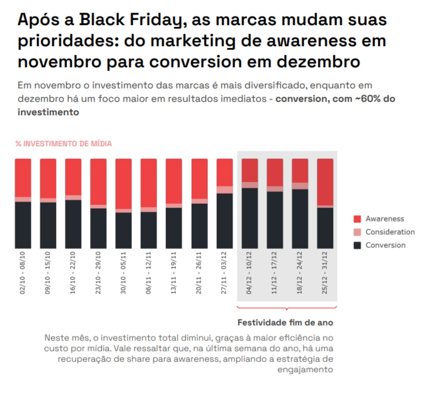 Em dezembro, o foco das marcas migra de awareness para conversão, com aproximadamente 60% do investimento direcionado para resultados imediatos. Segundo Guinezi, esta priorização impulsiona a eficiência do ROAS quando comparado com novembro.