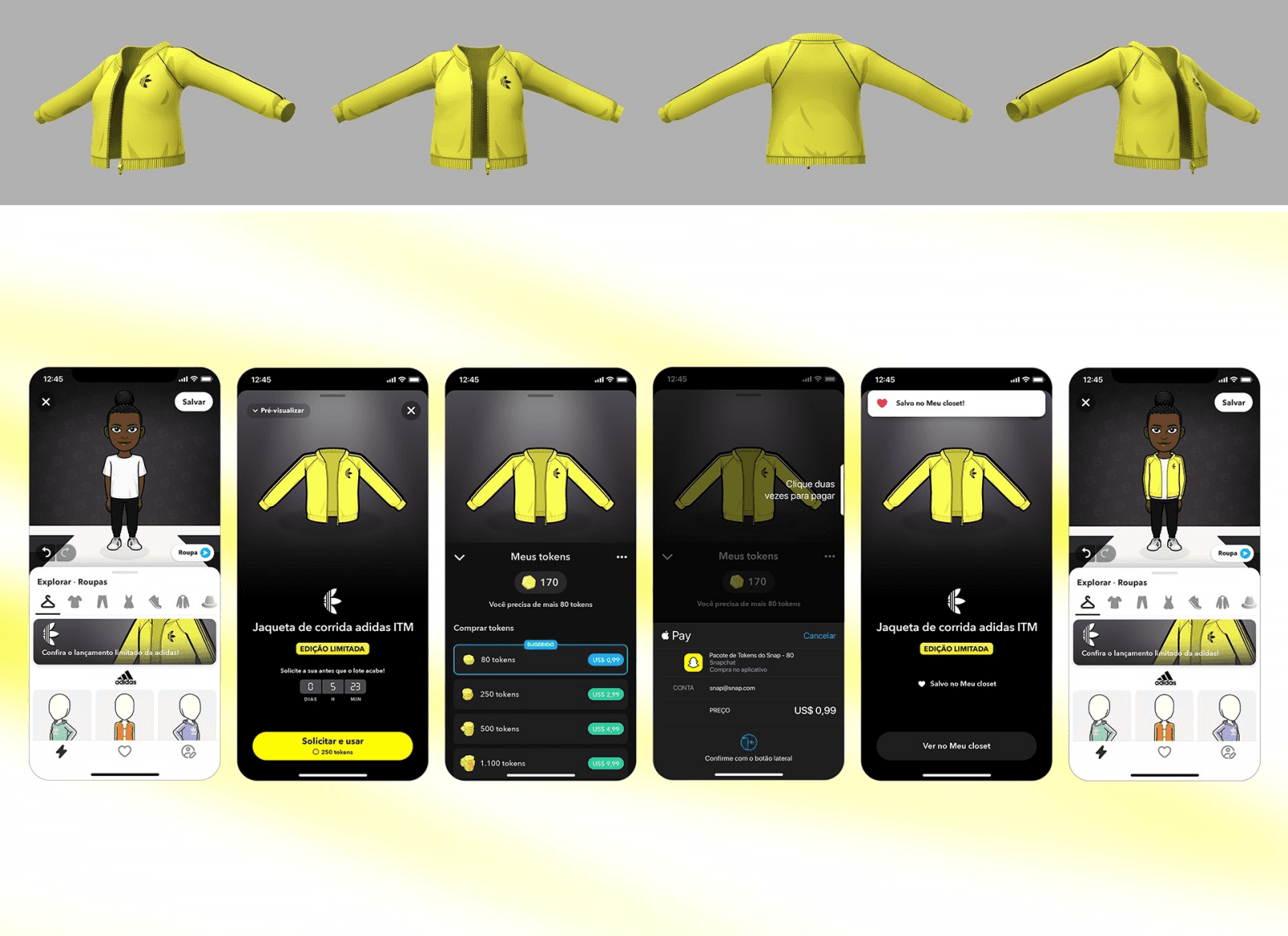 A Adidas e o Snapchat lançaram um Bitmoji Drop em parceria exclusiva, que permite que a comunidade do Snapchat use Tokens para garantir uma jaqueta exclusiva da adidas “Into The Metaverse” (ITM). Por tempo limitado, os usuários da rede social podem resgatar a jaqueta adidas ITM para seu avatar digital, o Bitmoji. O item tem a conhecida paleta de cor amarela da marca, bem como o logotipo adidas web3 e as linhas pretas nas mangas.