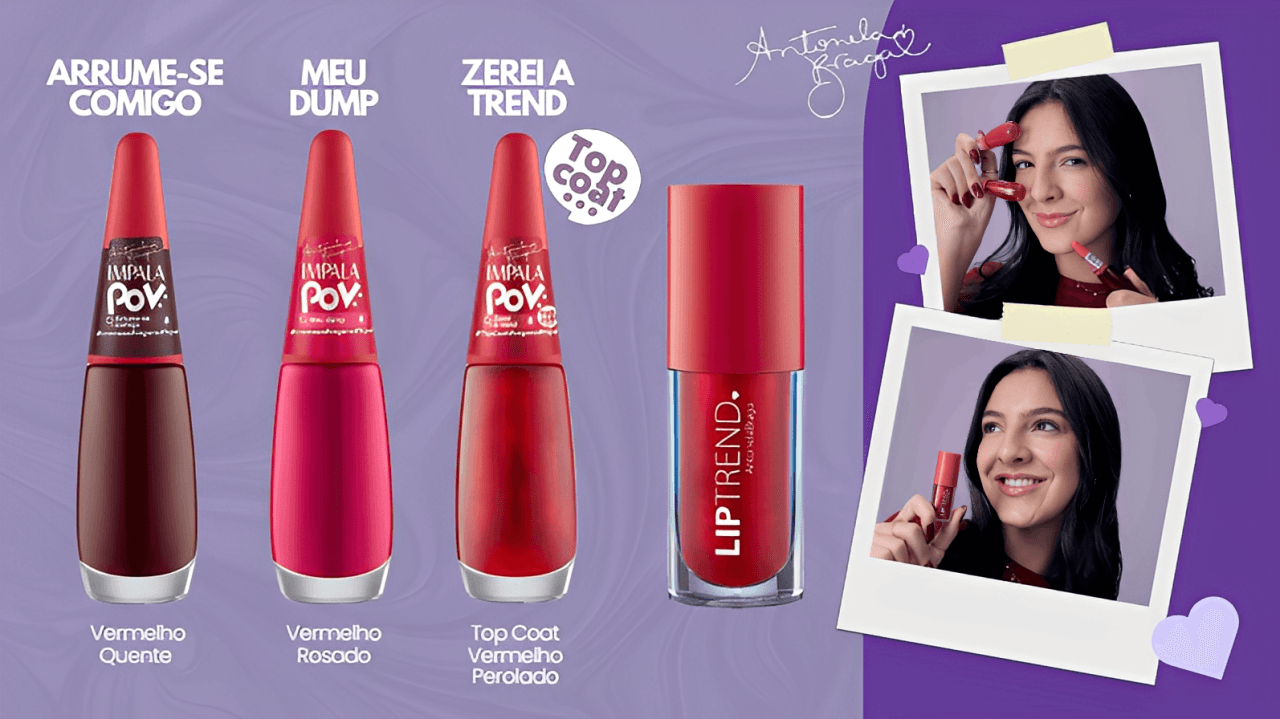 A Impala lançou a coleção primavera 2025 inspirada em quatro das criadoras de conteúdo mais populares da internet: Antonela Braga, Maria Nicolly, Luara e Marcella Bragança. Batizada de POV, a linha traz oito esmaltes, quatro top coats e quatro brilhos labiais, todos cocriados com as influenciadoras para refletir diferentes estéticas e estilos. A proposta é traduzir em cores a autenticidade e o humor que movem essa geração, em um movimento que une moda, beleza e cultura digital.