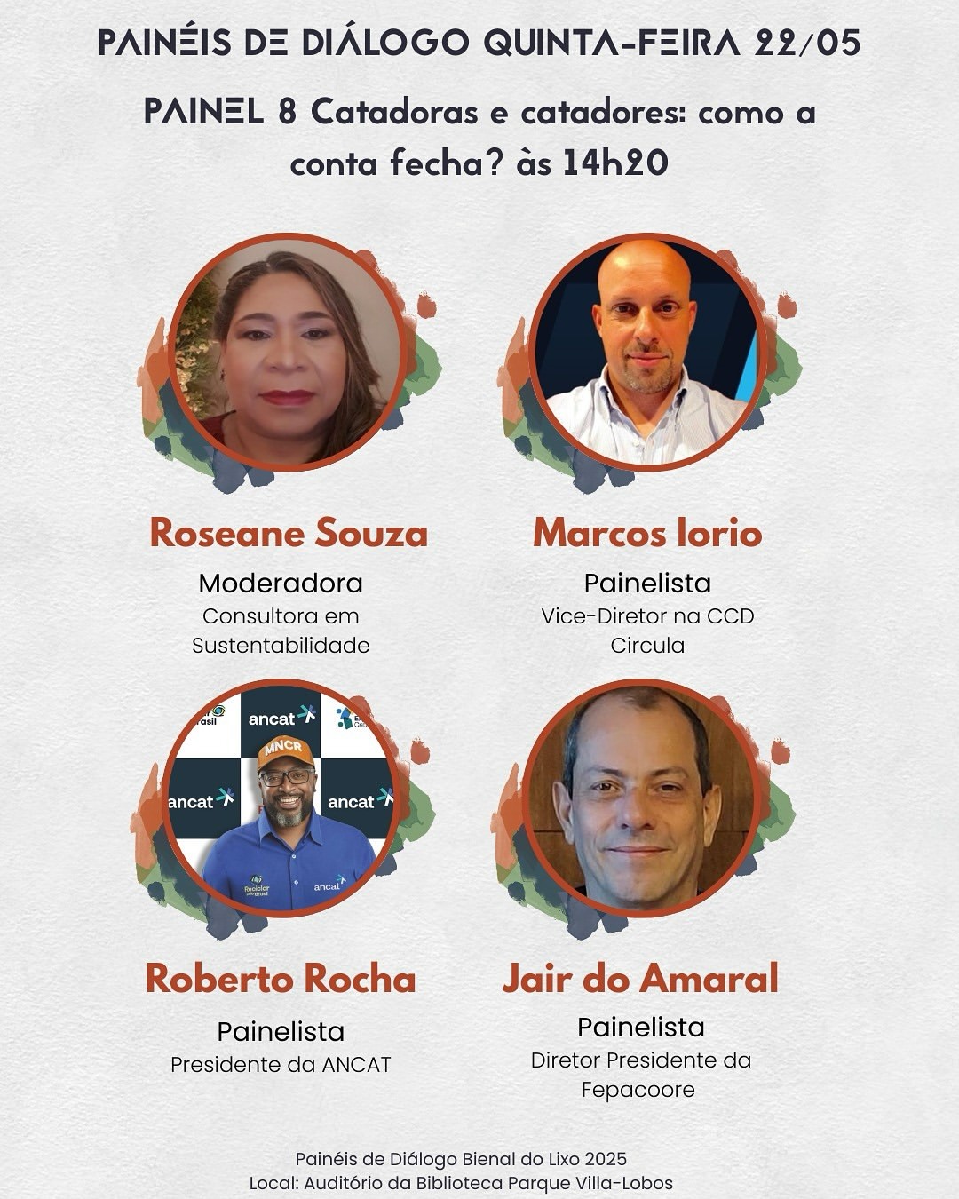 Na etapa final, o público interagirá com o painel “Compromisso circular – o passo que transforma”, onde poderá escolher uma mensagem que represente seu posicionamento e registrar sua assinatura na estrutura.