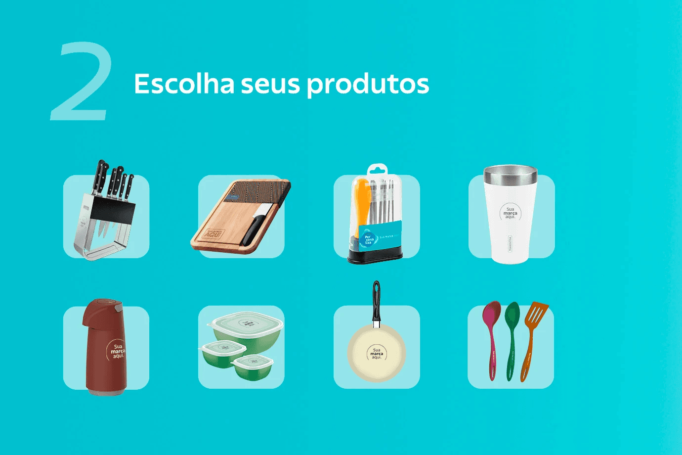 De copos térmicos e facas a utensílios de cozinha, ferramentas, móveis e muito mais. Produtos com design moderno, qualidade reconhecida e um processo de customização simples e ágil.