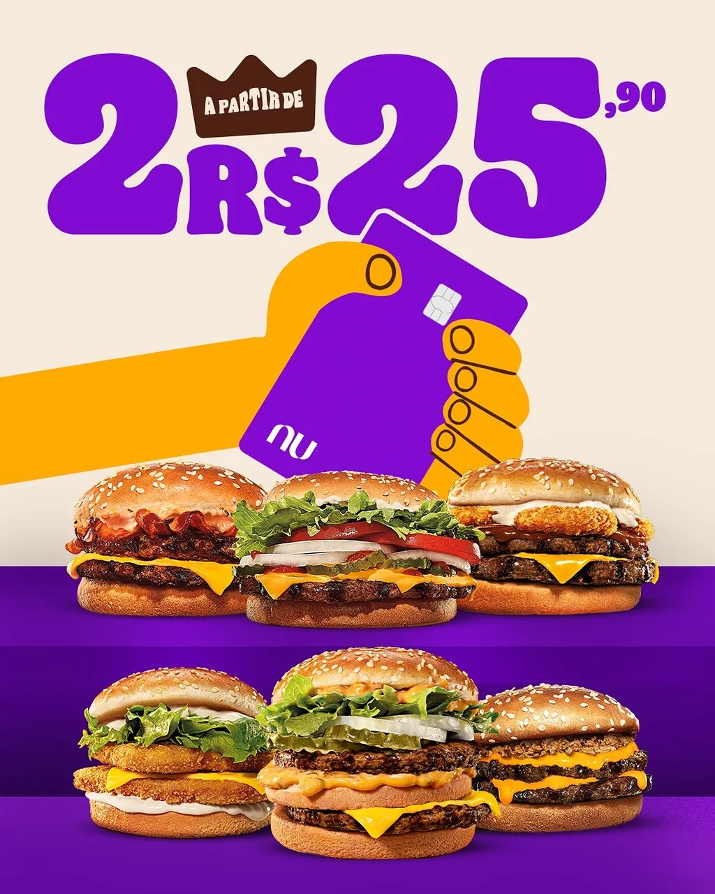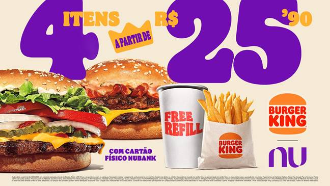 A partir desta quinta-feira (20), clientes que pagarem as compras nos restaurantes Burger King com o cartão físico Nubank, poderão adquirir dois itens a partir de R$ 25,90. A novidade expande a parceria entre o banco e o restaurante a pedido dos clientes que aproveitaram a primeira parte da collab.