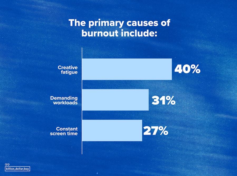 De acordo com o levantamento, os principais gatilhos para o burnout são a fadiga criativa (40%), a alta carga de trabalho (31%) e o tempo de tela ininterrupto (27%). Ainda assim, quando se trata de gravidade, a instabilidade financeira aparece em primeiro lugar, apontada por 55% dos entrevistados que sofrem da síndrome de esgotamento.