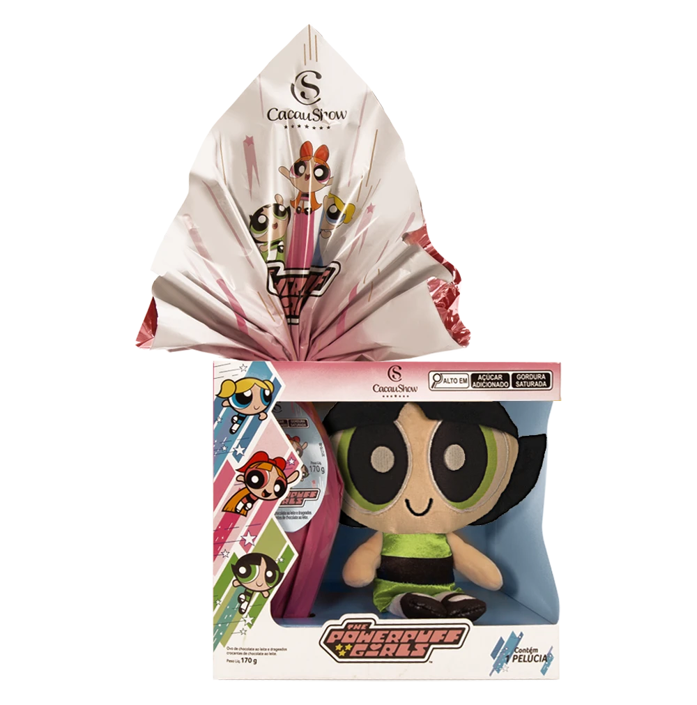 Ovo Pelúcia Meninas Superpoderosas (170g) - Ovo chocolate ao leite com drageados crocantes ao leite. O ovo vem acompanhado de uma das três personagens em pelúcias exclusivas e colecionáveis. Preço Cacau Lovers: R$ 119,99.
