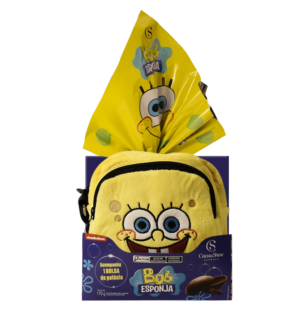 Ovo Bolsa Bob Esponja (170g) - Ovo de chocolate ao leite com drageados crocantes ao leite. Acompanhado de uma bolsa. Preço Cacau Lovers: R$ 139,99.