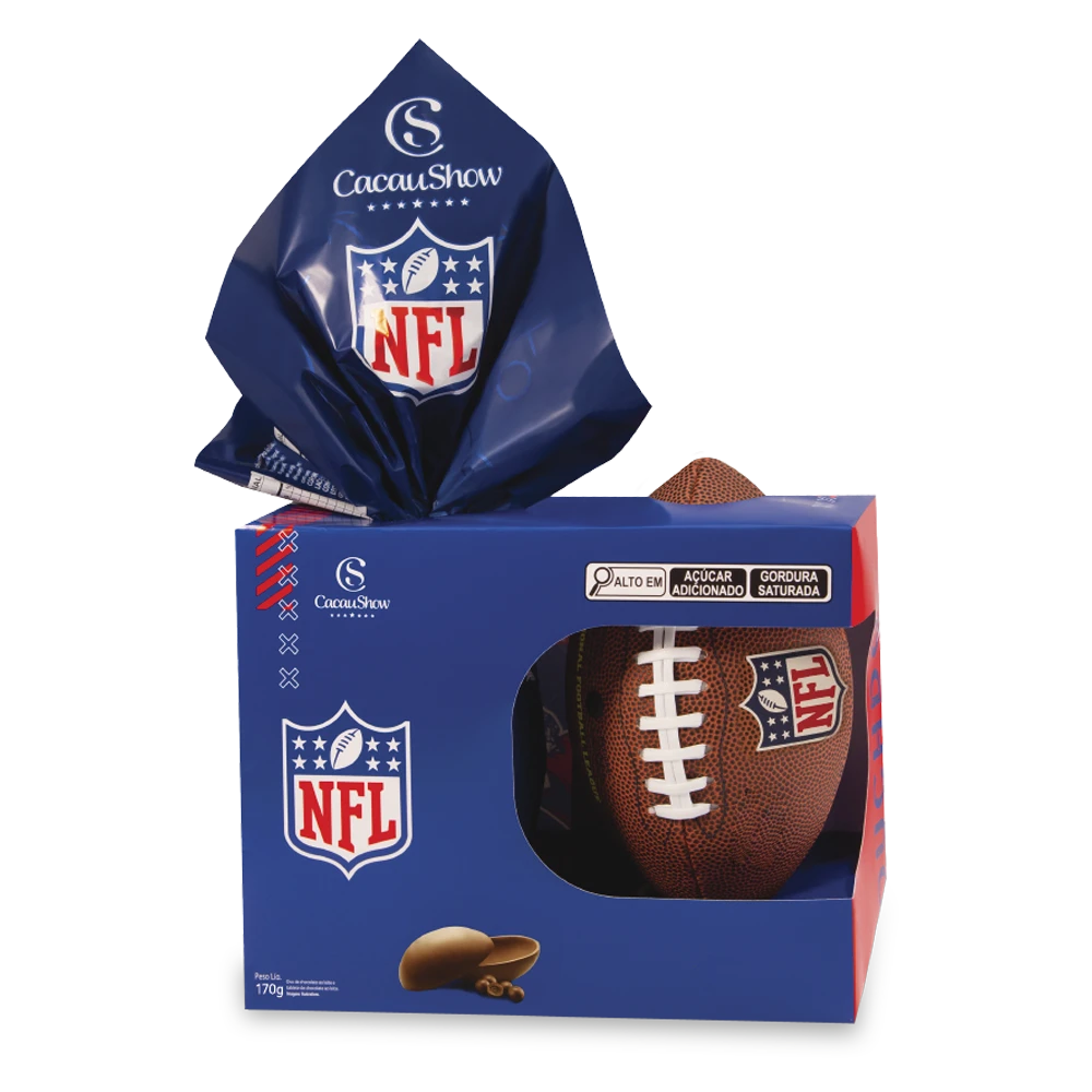 Ovo Chocoesportes NFL (170g) Ovo de chocolate ao leite com drageados crocantes ao leite. Acompanha uma minibola licenciada de futebol americano. Preço Cacau Lovers: R$ 124,99.