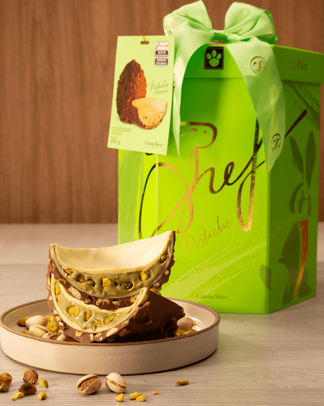 Ovo do Chef Pistache (600g) - Ovo de chocolate ao leite e branco, coberto pedaços de pistache torrado, recheio de creme de pistache e pedaços de pistaches. Preço Cacau Lovers: R$ 199,99.