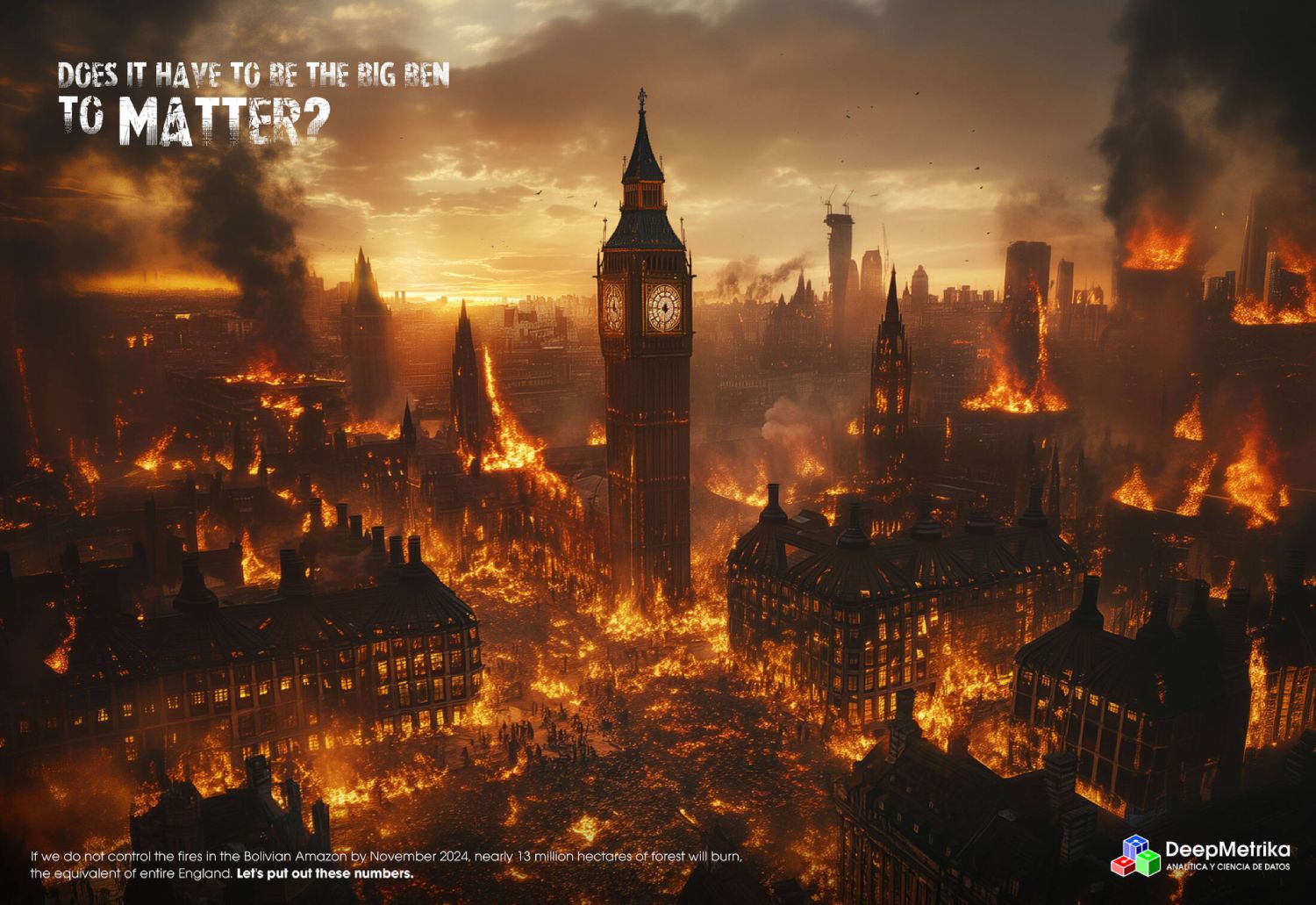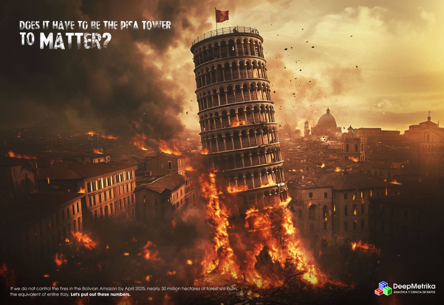 Considerando que a calamidade é amplificada pelo descaso dos governantes regionais e pela falta de reconhecimento público sobre o problema, a agência utilizou inteligência artificial para “atear fogo” em monumentos mundiais como a Torre Eiffel, o Big Ben e a Torre Inclinada de Pisa.