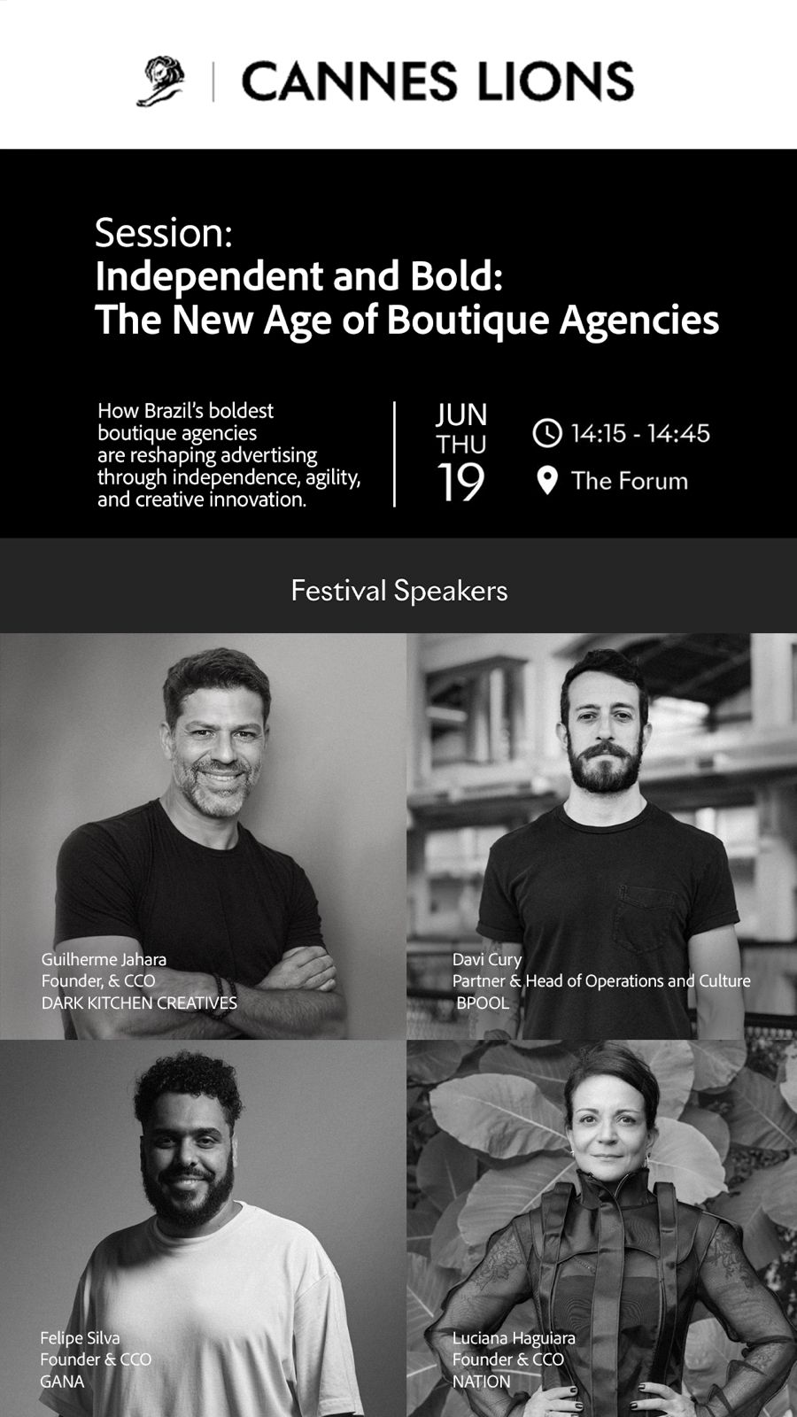 Reconhecido como o mais prestigiado evento das indústrias criativa e publicitária no mundo, o Cannes Lions acontece anualmente na França, reunindo profissionais de diversos países para celebrar campanhas, tendências e inovações da comunicação. Este ano, o painel está marcado para o dia 19 de junho e contará com a presença de Davi Cury (BPool), Guilherme Jahara (Dark Kitchen Creatives), Luciana Haguiara (Nation) e Felipe Silva (Gana).