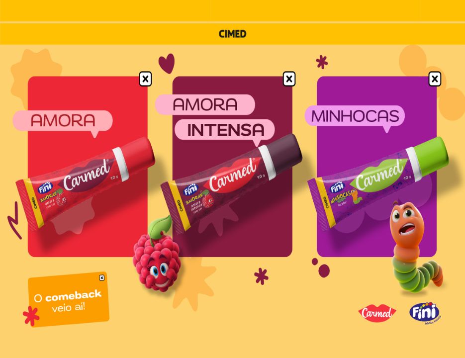 A colaboração entre Carmed e Fini começou em 2023. Com sabores icônicos como Beijos, Dentaduras e Bananas, a linha de hidratantes labiais viralizou nas redes sociais com mais de 1.4 bilhões de visualizações da hashtag Carmed Fini no TikTok. Neste panorama, o uso estratégico de influencers foi essencial para conquistar os consumidores.