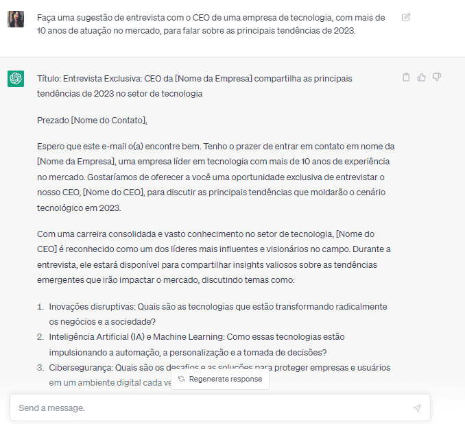 Finalizando os testes, pedimos um texto no formato de sugestão de uma entrevista que seria hipoteticamente realizada pelo CEO de uma empresa de tecnologia, com mais de 10 anos de atuação no mercado, para falar sobre as principais tendências de 2023.