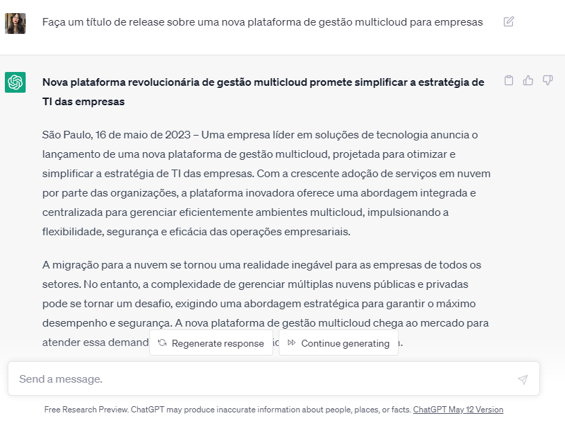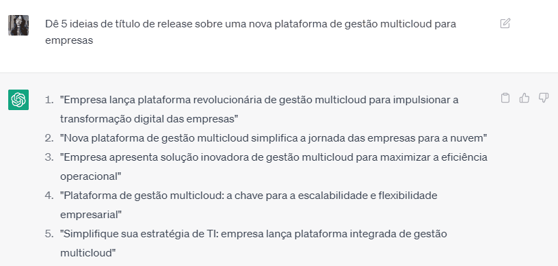 Por outro lado, o ChatGPT pode ser uma fonte de ideias para títulos de releases, por exemplo. Solicitamos cinco opções com foco no lançamento de uma plataforma de gestão multicloud para empresas.