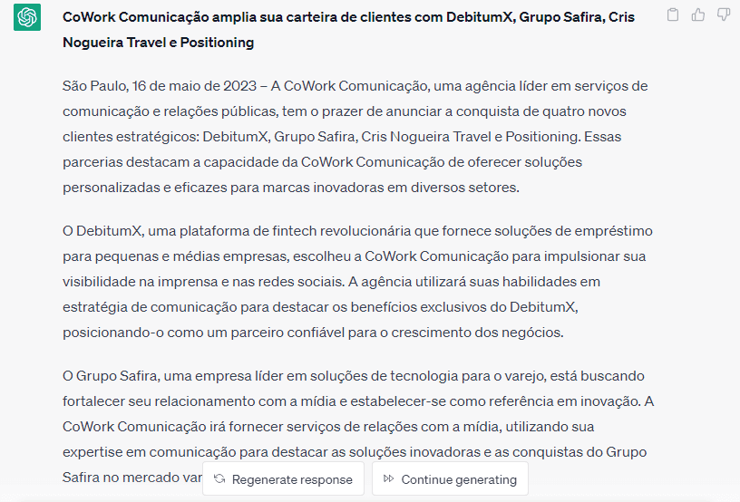Apesar do texto ser genérico, auxilia na estrutura das informações. Fizemos outro teste de escrita de release com informações mais específicas, usando como base uma pauta que já trabalhamos aqui na CoWork, para comparar os resultados.
