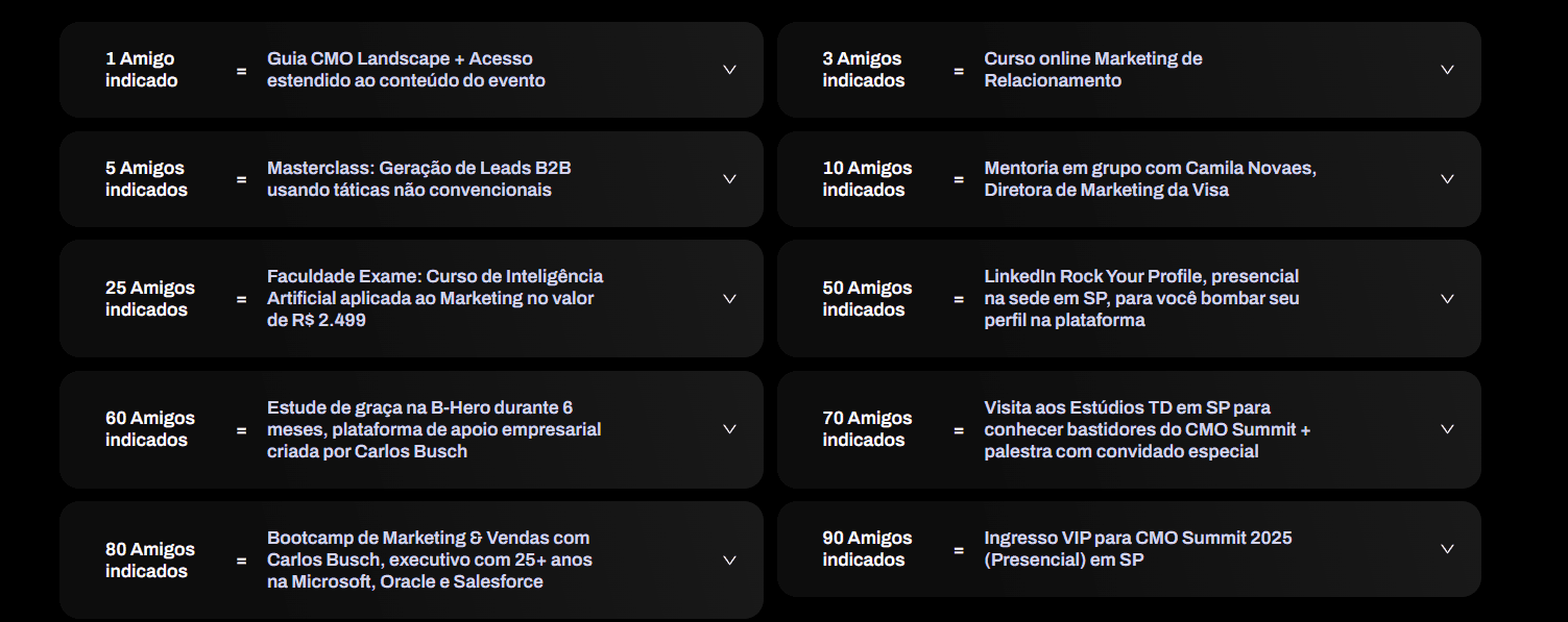 Subindo a tabela de premiações, os 25 primeiros inscritos que trouxerem consigo 25 pessoas terão acesso ao Curso de Inteligência Artificial aplicada ao Marketing da Faculdade Exame, no valor de R$ 2.499,00. As recompensas se estendem até as 90 indicações: os dez primeiros participantes a alcançarem o último patamar ganharão Ingresso VIP para o CMO Summit 2025 (Presencial), em São Paulo.