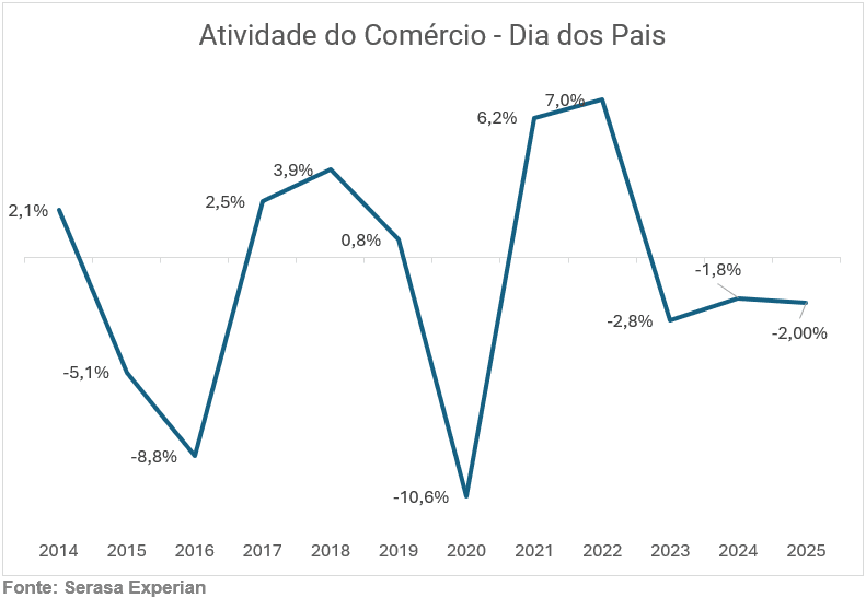 A atividade do comércio no Dia dos Pais de 2025 foi mais fraca do que nos anos anteriores. A data registrou retração de 2,0% nas vendas, considerando as consultas de crédito realizadas entre 4 e 10 de agosto, de acordo com o Indicador de Atividade do Comércio da Serasa.