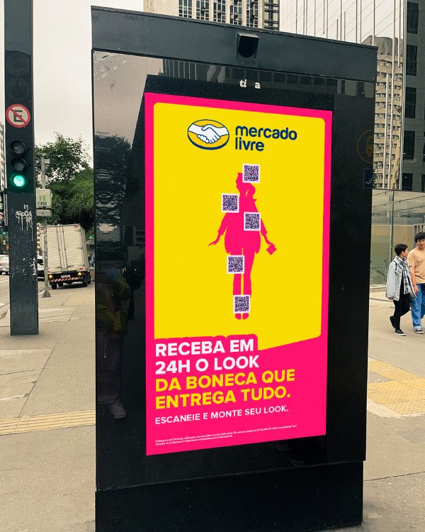 As mídias mostram diferentes silhuetas da Barbie com QR Codes que levam a peças que recriam os estilos marcantes da boneca disponíveis no Mercado Livre e com entrega em apenas 24 horas.