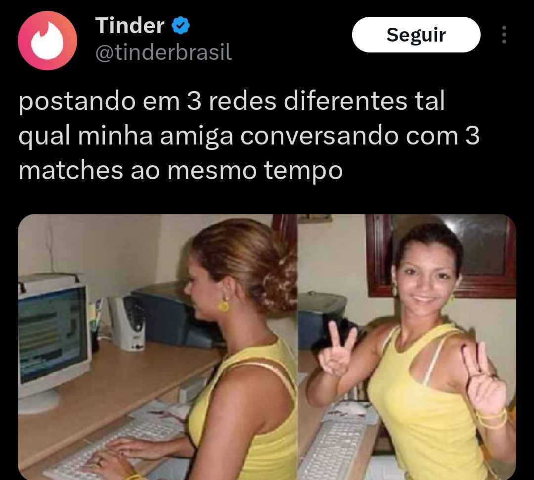 “Postando em 3 redes diferentes tal qual minha amiga conversando com 3 matches ao mesmo tempo”