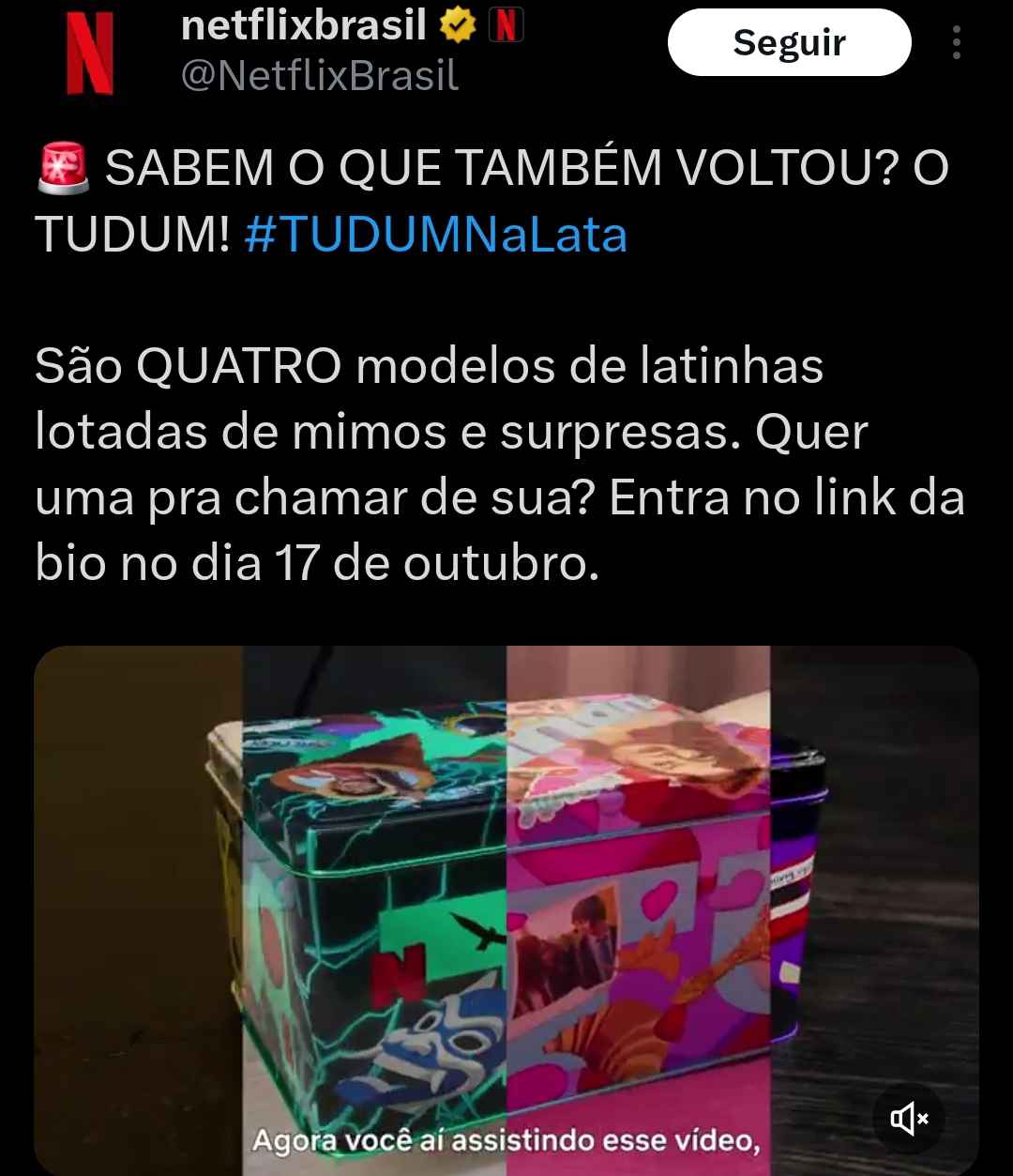 “Sabem quem também voltou? O TUDUM! São quatro modelos de latinhas lotadas de mimos e surpresas. Quer uma para chamar de sua? Entra no link da bio no dia 17 de outubro”.