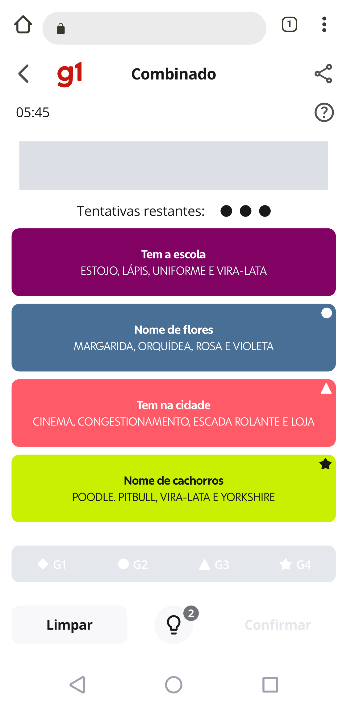 A jornada é ainda mais fluida no app do g1, que conta com navegação direta para os jogos e notificações personalizadas. Lançado recentemente, o Combinado se diferencia por propor um novo tipo de desafio: o jogador deve identificar quatro grupos temáticos entre 16 palavras organizadas aleatoriamente. Os temas variam de categorias simples, como frutas, até conexões mais inusitadas, como bandas dos anos 80 ou partes do corpo humano.