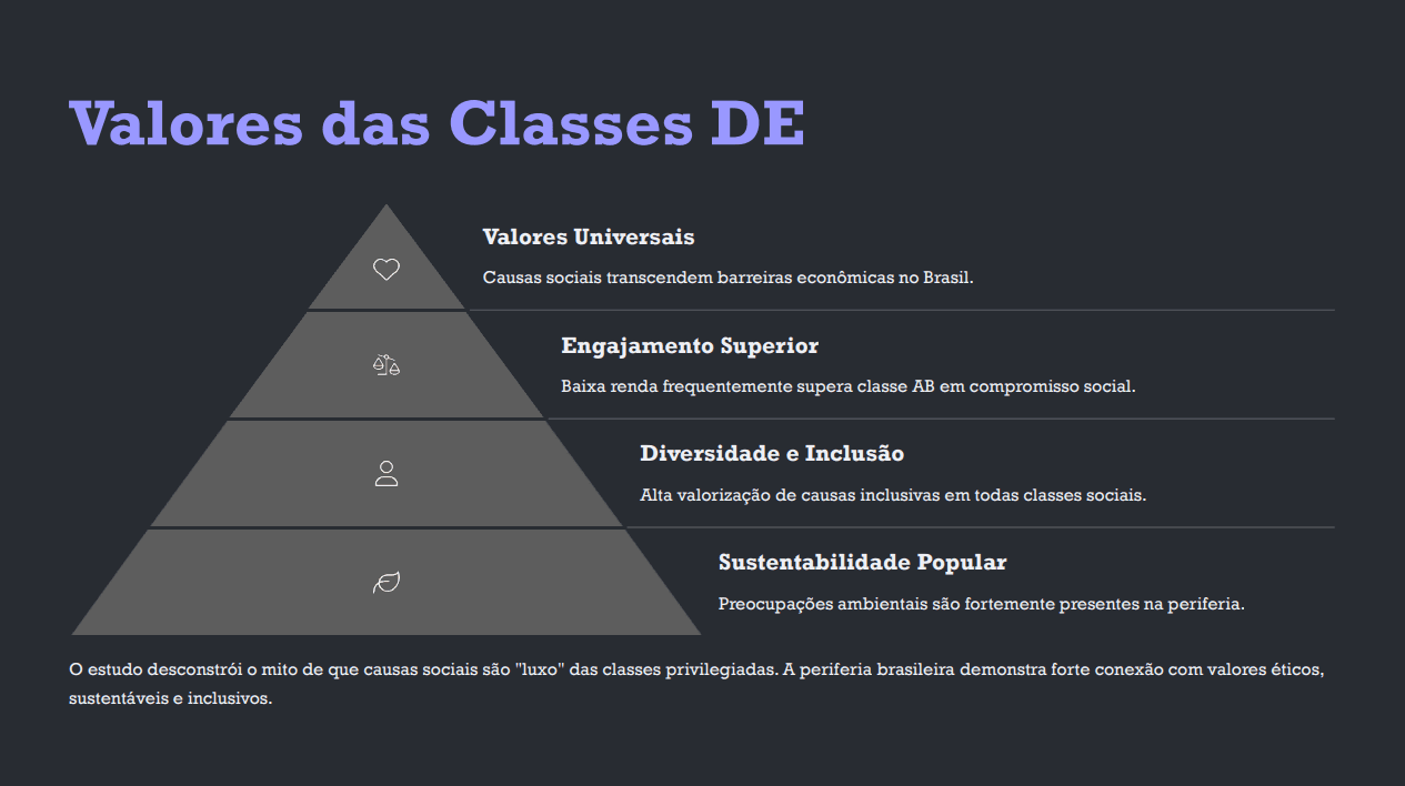 Outro dado relevante do estudo é o comprometimento social das classes D e E. Questões como direitos dos idosos (88%), inclusão de pessoas com deficiência (87%) e sustentabilidade (79%) são altamente valorizadas, frequentemente com índices superiores aos das classes mais altas.