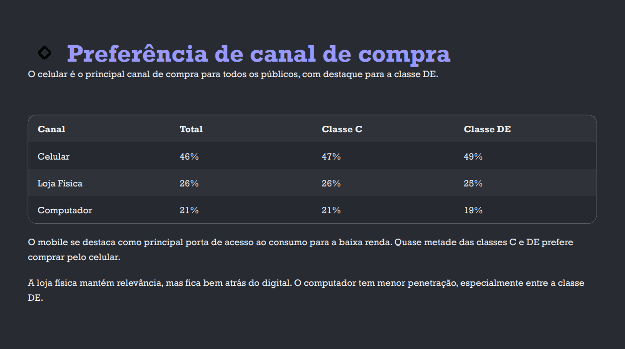 Os dados mostram que a intenção de ampliar o consumo entre as classes D e E supera a média nacional (57%), enquanto apenas 6% desse público pretende reduzir os gastos, sinal de forte tendência de consumo. O celular aparece como o canal de compras preferido por 49% dessas pessoas, percentual acima da média geral (46%).