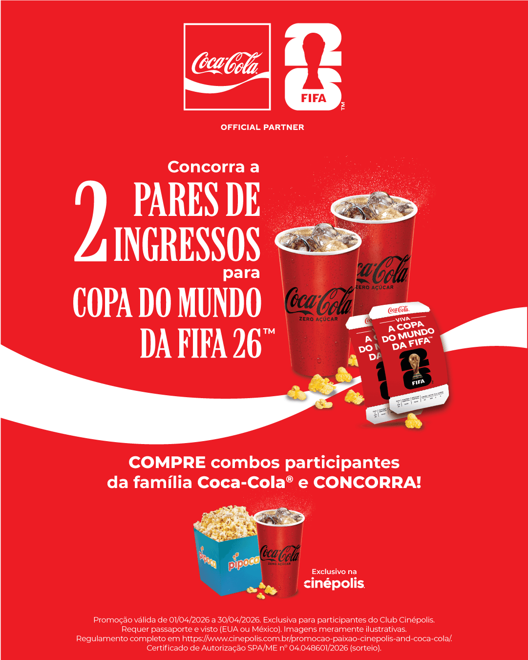 Cinépolis + Coca-Cola - Compra de combos participantes nas bombonieres gera números da sorte. É necessário cadastro no Club Cinépolis. O prêmio inclui viagem completa e ingressos para jogos da Copa.