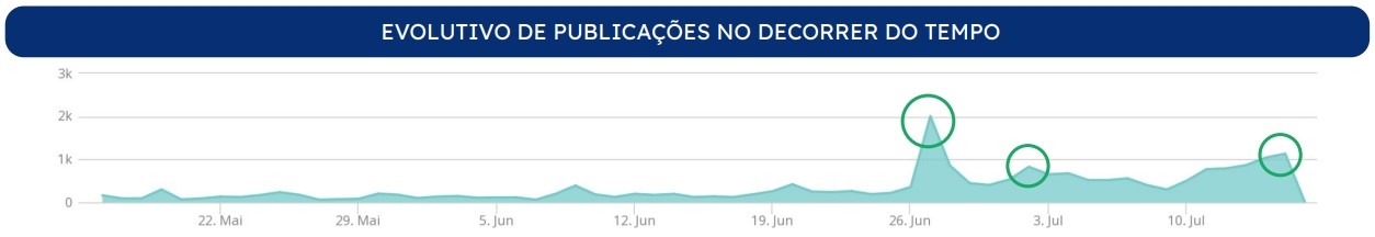 Outros picos de menções aconteceram no dia 2 de julho, quando a goleada do Brasil em amistoso contra o Chile totalizou 827 publicações sobre o assunto, e no dia 15 de julho, 15 de julho, quando o foco principal do debate online circulou ao redor das possíveis mudanças na jornada de trabalho durante os dias dos jogos da Seleção. Naquele dia, mais de 1.100 posts tratavam sobre o assunto.