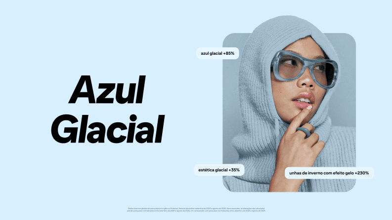 A cor remete a superfícies geladas e atmosferas etéreas, criando contraste entre leveza e intensidade. Entre as buscas em alta estão “unhas com efeito gelo”, com crescimento de 230%, “azul glacial”, com aumento de 85%, e “estética glacial”, que avançou 35%.