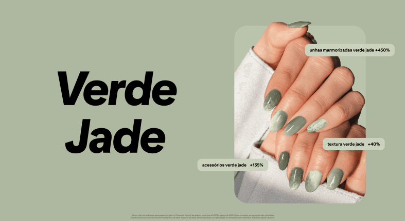 A tonalidade une naturalidade e luxo, aparecendo com força em moda, decoração e beleza. As pesquisas por “unhas marmorizadas verde jade” cresceram 450%, enquanto “acessórios verde jade” registraram alta de 135% e “textura verde jade”, 40%.