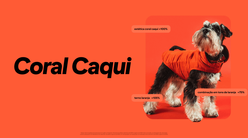 O tom se destaca como uma cor solar, associada a alegria e presença. Entre os termos em ascensão estão “terno laranja”, com crescimento de 105%, “estética coral caqui”, com 100%, e “combinação em tons de laranja”, com 75%.