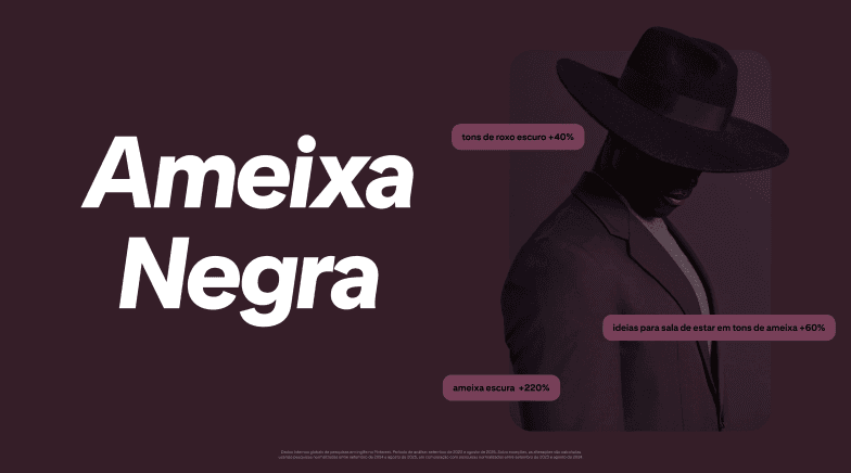 A cor mistura nuances de vinho e marrom aveludado, associadas a ambientes sofisticados e a uma estética de impacto. Termos como “ameixa escura” tiveram crescimento de 220%, “ideias para sala de estar em tons de ameixa” avançaram 60% e “tons de roxo escuro” subiram 40%.