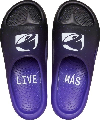 Inspirado no preto e roxo exclusivo da Taco Bell, a collab apresenta uma tonalidade degradê com "Live" e "Más" impressos separadamente em branco em cada palmilha. Os calçados são indicados para ocasiões casuais, como idas à praia ou passeios em parques.