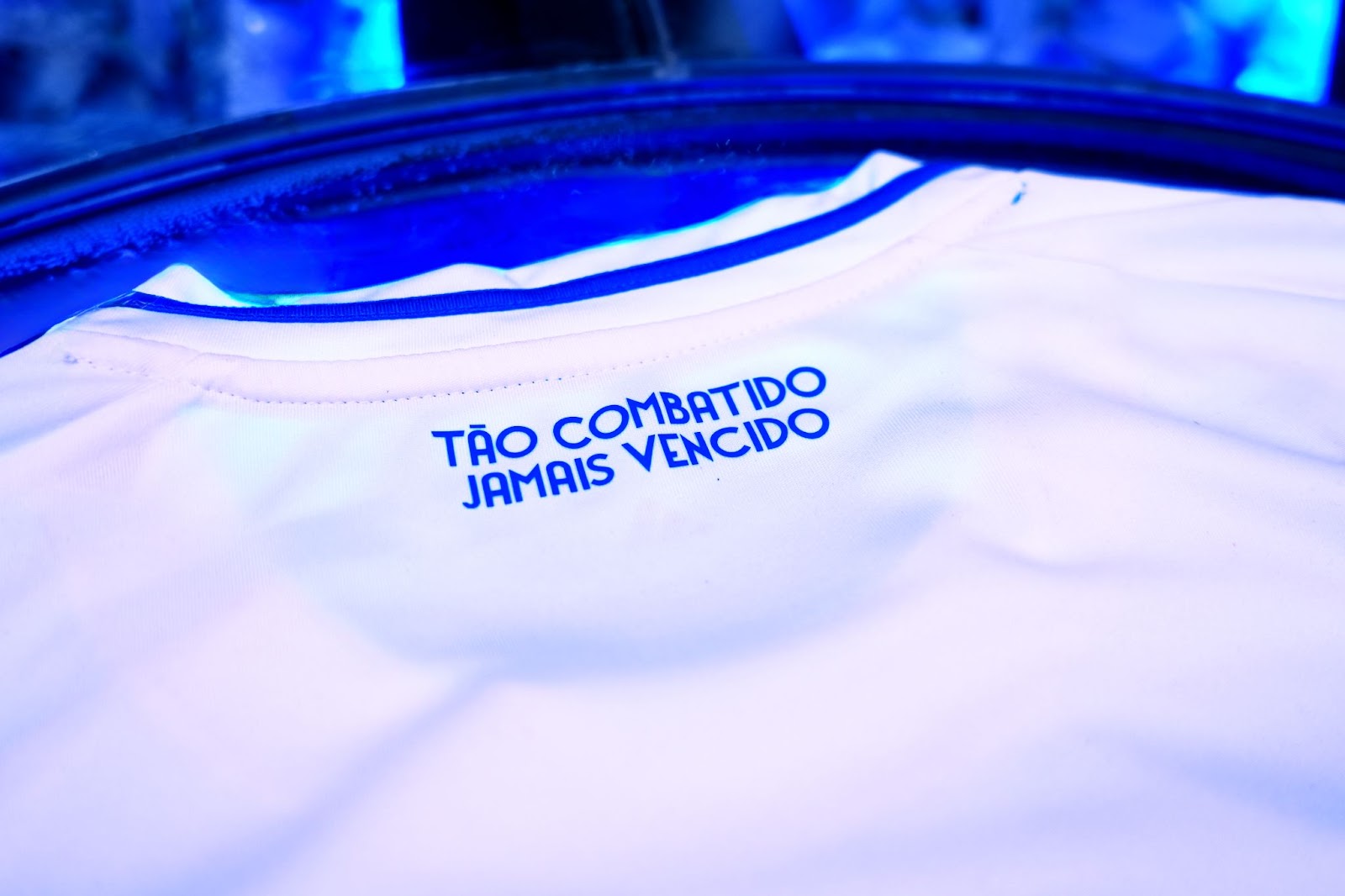 Com um design exclusivo e repleto de significado, o manto celebra a ligação profunda entre o clube e sua torcida. Predominantemente branca, a camisa traz grafismos azuis na parte frontal que representam as ondas sonoras extraídas do hino. Já na parte superior das costas, logo abaixo da gola, está gravada a frase “Tão Combatido, Jamais Vencido”, verso que encerra a canção cruzeirense.
