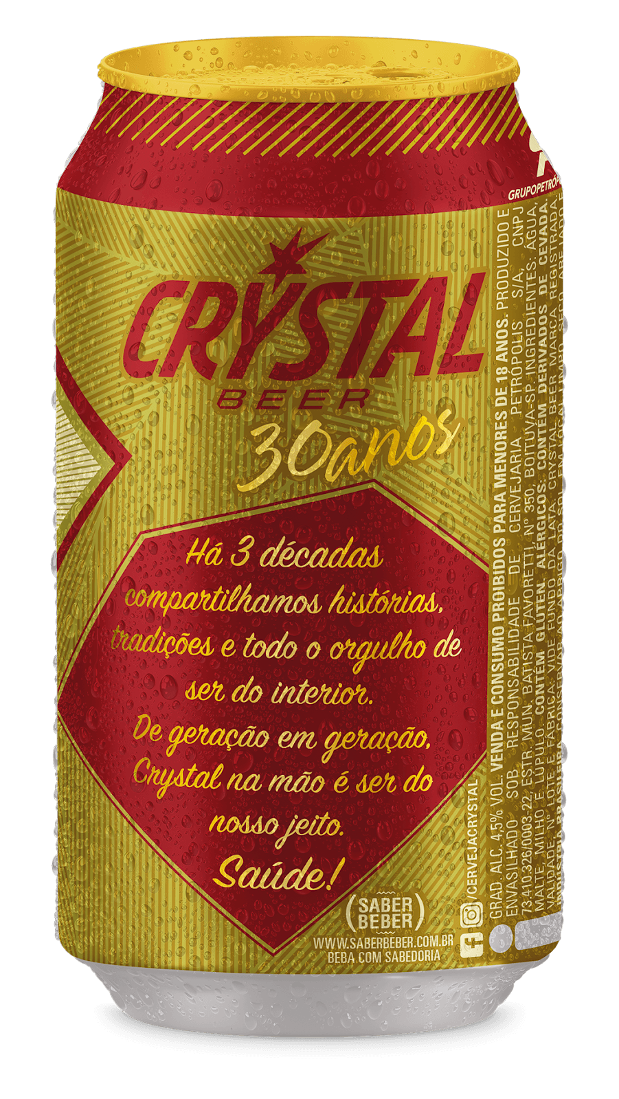 Para celebrar as três décadas, a Crystal desenvolveu uma estratégia integrada que inclui embalagem comemorativa (lata e garrafa), ações no ponto de venda, endomarketing, patrocínio da Expo Fernandópolis e relançamento das mídias sociais. "Quando a gente fala de uma marca mais democrática, tenho que olhar o meu 360 de uma forma completa para estar mais próximo desse meu target", justifica Cristiane Rosa.