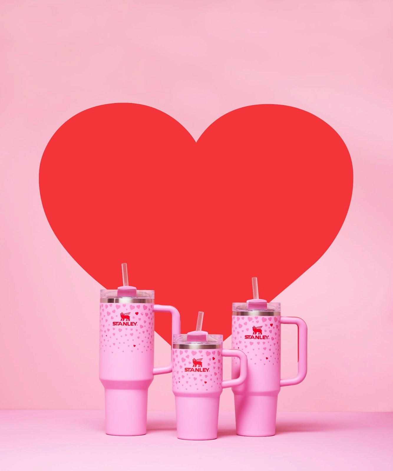 Para reforçar e celebrar os contrastes, a marca lança uma edição especial: o Quencher Sweet Hearts Stanley – uma edição limitada na cor rosa e com estampa de corações, bem romântica, em celebração ao Dia dos Namorados.