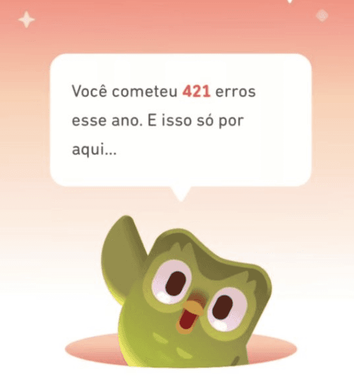 Tal como retrospectivas semelhantes, nas quais marcas parabenizam usuários por feitos específicos, o recap do Duolingo aposta no poder motivacional com elogios bem-humorados, sem deixar de lado a ironia característica de Duo. A coruja aponta, de forma clara e direta, quantos foram os erros cometidos pelos alunos ao longo do ano.