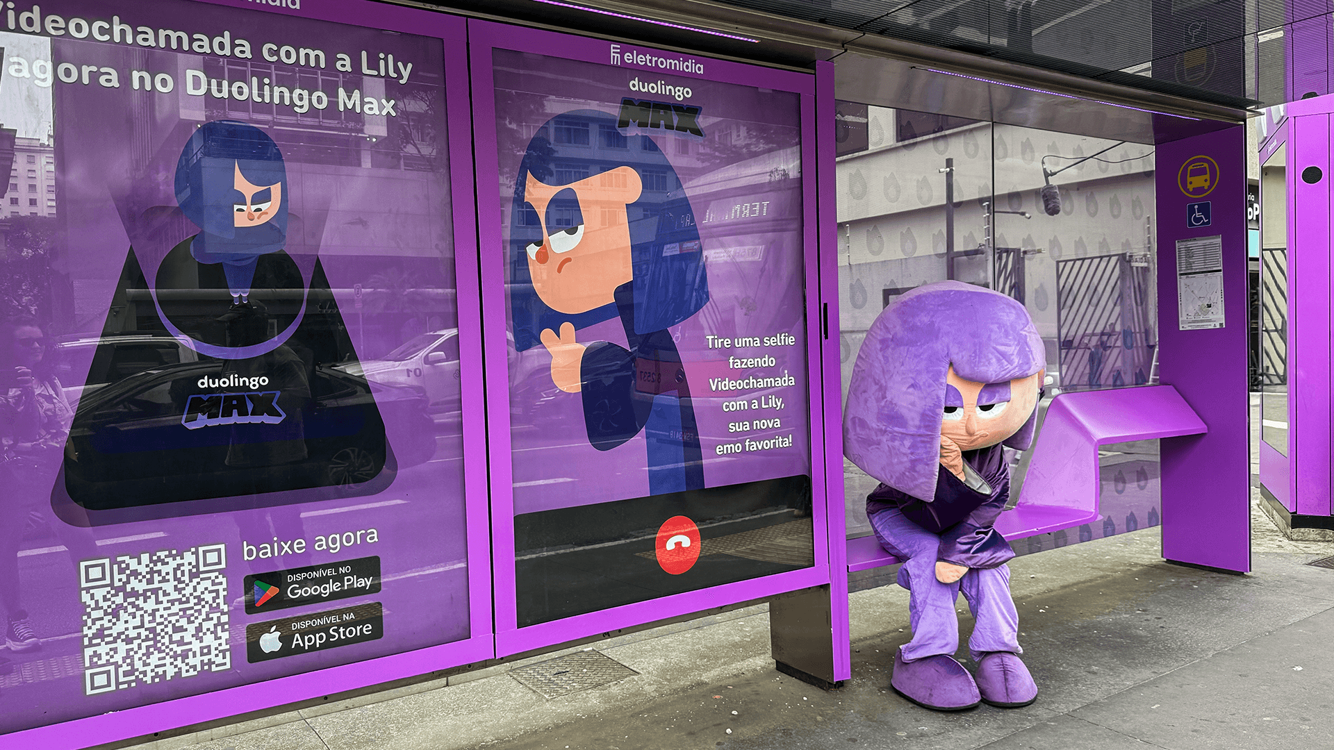 O Duolingo expandiu a funcionalidade Videochamadas com Lily para usuários de Android no Brasil e lançou uma ação Out-of-Home (OOH) para marcar a novidade. A campanha, desenvolvida pela Jotacom em parceria com a Eletromidia, leva a personagem Lily para interagir com o público em um ponto de ônibus na Avenida Paulista, simulando a experiência do aplicativo no mundo real.
